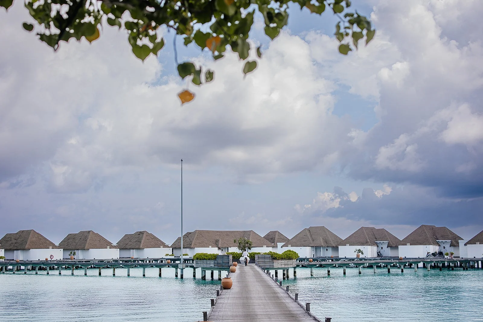 Overwater bungalows with thatched roofs connected by a wooden dock, leading to a person walking on the dock, under a cloudy sky.
