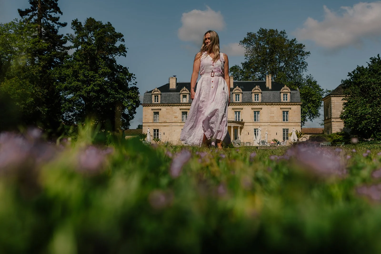 A woman in a long, sleeveless, light pink dress walking on a lawn in front of a large, classic mansion with multiple windows and a slate roof, surrounded by trees under a partly cloudy sky.